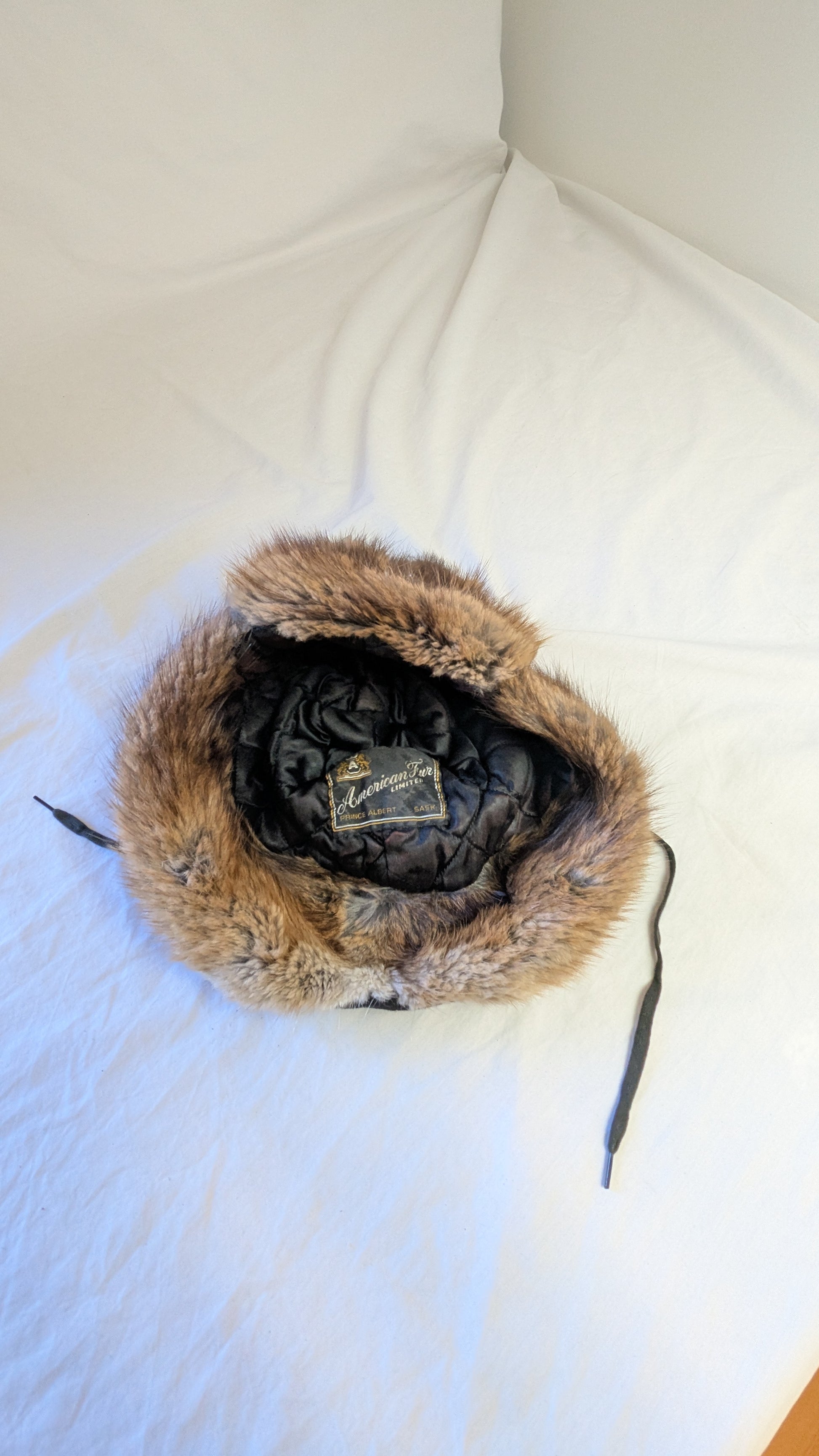 Warm American Fur trapper hat. Has black fabric with brown fur trim. Great for cold weather. From American Fur Limited, Prince Albert Sask.