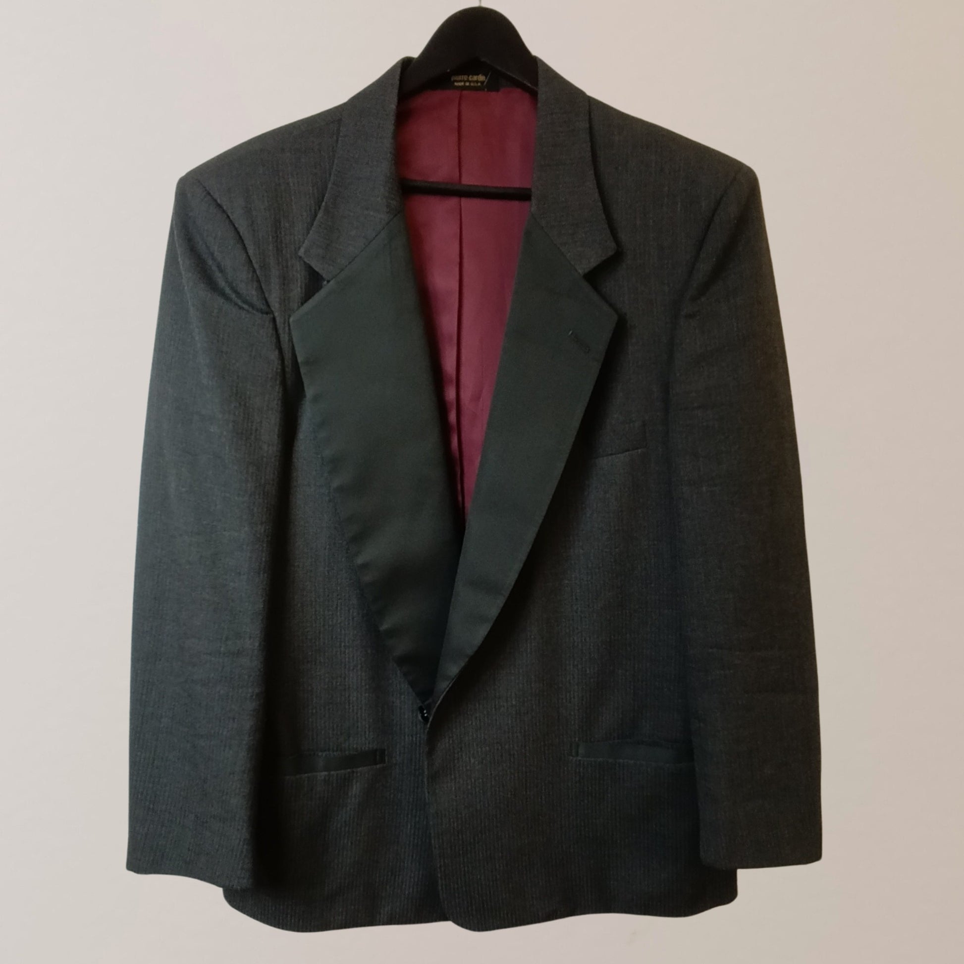 This pre-loved Pierre Cardin suit jacket exudes a refined elegance that is effortlessly timeless. Crafted in the USA and presented in a versatile gray, this secondhand piece showcases thoughtful design and enduring style. The single-button closure adds a clean, modern touch, making it suitable for both formal occasions and casual everyday wear.