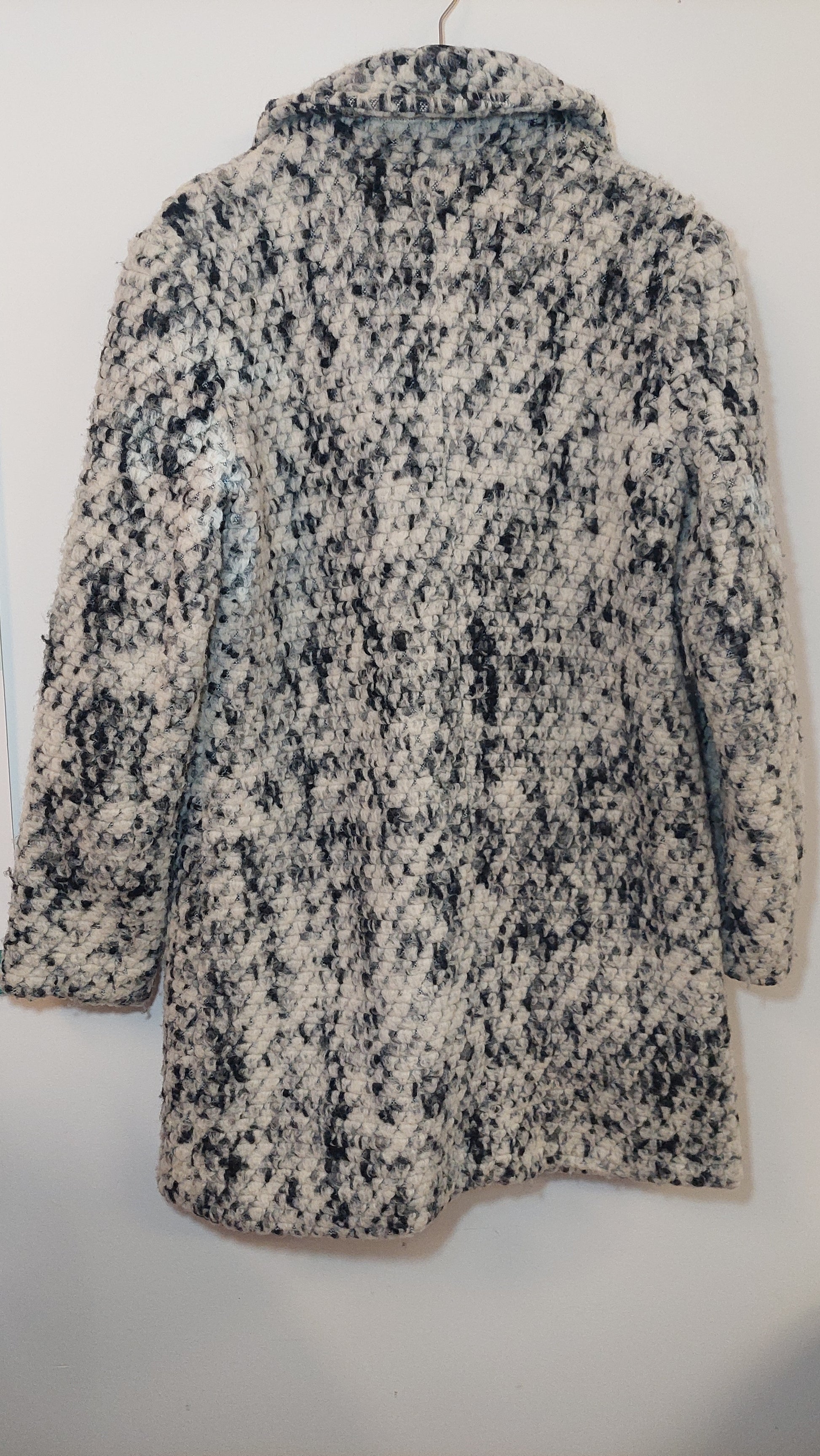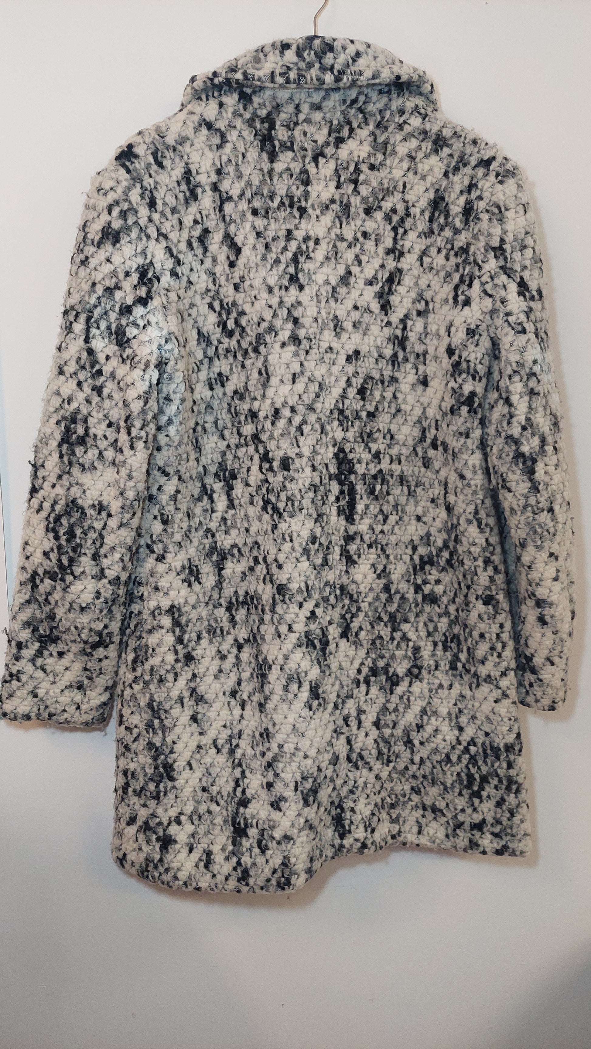Second-hand Steve Madden coat, size M, features a distinctive white and black pattern that offers a versatile yet bold statement. Crafted for both style and comfort, its tailored fit ensures a flattering silhouette. As a pre-owned piece, it presents an opportunity to own a high-quality item with character and sustainable appeal, ideal for those seeking expert-level fashion choices with a conscious edge.