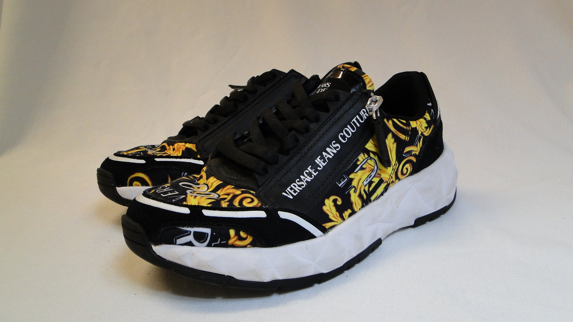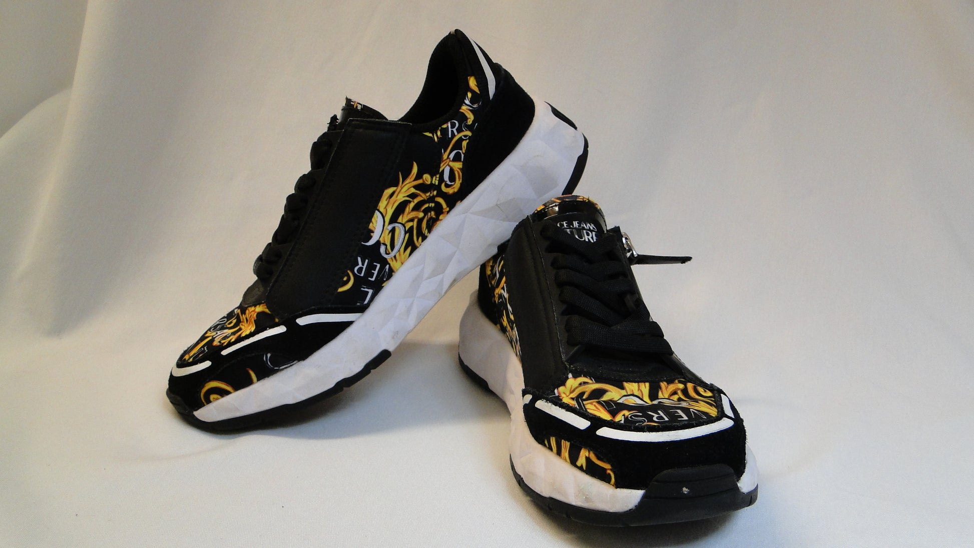 These pre-owned Versace Jeans Couture sneakers offer a bold yet polished look, combining classic black with striking gold accents for a truly designer finish. They possess a confident presence that only a luxury secondhand find can provide—eye-catching without being overwhelming and effortlessly stylish from the very first step.